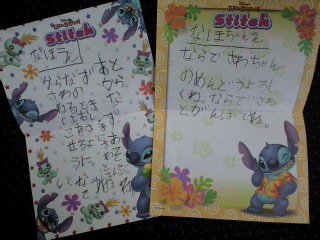 今日からさわぞ~は【おぢばがえり】に行きました。別にうちが天理教ってわけではないんですが、従姉妹どうしで出かけていきました。おうまっくすと一緒に親戚のうちへお泊りした事あるんだけどさわぞ~が1人で泊まりに行くのは初めて。しかも2泊3日だなんて私よりお父さんのほうが、かなり心配してるようで朝から何回もスケジュールを見たりしてソワソワしてました朝7時に出発して、お昼前には奈良県へ着いているはずですがなんとかやってるのかしら。。。4歳じゃ、携帯も使えないし、自分の家へ電話もできないから従姉妹の菜穂に連絡してもらうよう頼みました。菜穂は小学6年生で、1年の時から毎年行ってるの。しかも3人兄弟で女の子1人だから結構面倒見もよくて。さわぞ~なら連れてってくれるって事で今回は一緒に行く事になりました。ちょっと2泊3日なんて、まだ早すぎたかな・・・って思いもあるけど、さわぞ~なら何とかなるだろうと信じてます昨日の夜、さわぞ~の荷物を準備しているとおうまっくすが手紙を書いていました。”絶対にお母さんが読まないでよ 菜穂ちゃんに渡してよ”って事だったので、菜穂に渡しながらちょっと見せてもらいました。手紙の中身はこうです・・・”なほえ かならずさわのねるときは おしっこさせるように あと かならず あそぶときに さわと はなれなくしてね””なほちゃんえ ならで さわちゃんの めんどう よろしくね。 ならで さわちゃんと がんばってね”小学1年生のおうまっくすが書いた心優しいお手紙に、お父さんもお母さんも感動しました。みんなで心配してるんだよね。いつも喧嘩ばっかりしているけどしっかりお兄ちゃんしていました。嬉しかったですさわぞ~は4日(月)の夜に帰ってくるのでみんなでご飯でも食べに行こうと思います。そして5日(火)からは、今度はおうまっくすが1泊2日の野球塾の合宿です。来週も忙しくなりそう・・・