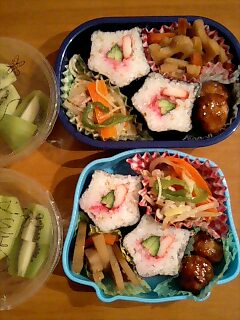 昨日に引き続き、今日も土曜保育でお弁当です。またしても新アイテムをGET!!したのでちょっと【のり巻き】を作ってみました星型の巻き簾は初めて使ったので角にうまくご飯が入っていかなくて丸っこい星型のり巻きになっちゃいましたもうちょっと修行が必要なようです・・・のり巻きの中身は、桜でんぶときゅうりとカニカマです。ご飯はお酢のご飯にしないで、おにぎりと同じように白ゴマとお塩を混ぜています。さて、今日のおかずは【野菜ビーフン炒め・レンコンのきんぴら・鶏つくね キウイ】朝、お弁当の中身を覗きにきたおうまっくす。のり巻き1本を見て”オレ、これぜ~んぶ食べれるやぁ~”って。・・・でも、さわぞ~と2人で半分こですよお弁当じゃなくても、こののり巻きは挑戦しようと思いますもうひとつ、お花の形になる巻き簾もあったのでそっちも使ってみよう