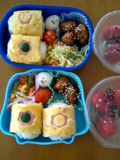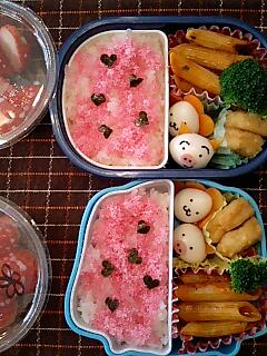 今日は今年度最後の土曜保育のお弁当になります4月からおうまっくすは【にじ組】←年長さんさわぞ~は【さくら組】←年小さんになります今日のお弁当もちょっと春らしく、お花を型抜きしました。ちょっと寝ぼけながら薄焼き玉子を焼いていたらひっくり返すのに失敗・・・破けてしまいましたなんとか補修しつつ、俵型のおにぎりにハムを巻いてから薄焼き玉子を巻きつけましたうずらの玉子とウィンナーは、ちょっとかわいく細工しました見えますか~~~うずらの玉子は【うずらちゃん】。ひよこ?というか、絵本にでてくるうずらちゃんをイメージ。ウィンナーは【イノシシくん】です。キッチンバサミで、背中の部分にトゲトゲの切込みを入れて焼き付けた後、目は黒ゴマを埋め込みました今日のおべんとうのおかずは、【鶏だんごテリヤキ、春野菜炒め、うずらの玉子、ウィンナー イチゴ】です。おとといの夜、おうまっくすはイチゴを食べ過ぎて大量に吐いたんです食欲がイマイチ回復していないようですが、ちゃんと食べれるんだろうか・・・まぁいずれにしても、おうまっくすにとっては【ぶどう組】とさわぞ~にとっての【うさぎ組】最後の日を満喫してきてね~