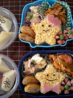 本当は昨日のことなんですが、なんてったって仕事が忙しい~~~アップが間に合っていません・・・1日遅れの【土曜保育のお弁当】画像です今日は【お星さま弁当】と名付けましたまずは、ちょっと甘めのそぼろ玉子を作っておにぎり型に軽く詰めて上からご飯を乗せて形を作ります。おうまっくすには蝶ネクタイを、さわぞ~にはお花の髪飾りをつけてあげましたとっても喜んで、あっという間に食べちゃいました・・・って保育園からのお便りに書いてあってお母さんも嬉しかったです今日のおかずは、【マカロニのナポリタン・ポテトサラダ・白身魚のフライ お花のウィンナー・リンゴ・苺】夜、帰ってくるなり”ほらぁ~ 空っぽだよ~~~”って嬉しそうにお弁当箱をキッチンに持ってきて見せてくれたさわぞ~。いっぱい食べて、『元気もりもりマン』になるんだって