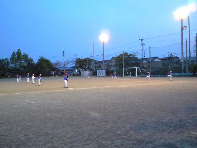 昨日はおうまっくすの【野球塾】の日でした。いつものように仕事が終わってから、さわぞ~を連れて練習風景を見学6月にティーボール県大会の地区予選があったんだけど1~2年生しかいないとはいえ、大差で負けてしまったので昨日の練習は、なんだかスゴイ練習でした。まずは、フットワークの基礎練習。はしご状になったテープがあって、いろんなステップで走っていくんだけど、リズム感のないおうまっくすにはなかなかコーチのいうような動きができず、イライラしてました次は、ノック。結構なスピードでワンバンしてくるボールをみんな怖くて怖くて・・・逃げ腰になるとコーチに怒鳴られ、返事をしないと怒鳴られおうまっくすも腕に打球が当たってうずくまって泣いてましたでも、ノックの前に”ボールが当たっても、絶対泣くなよ”とか言われて、泣きながらボールを受けてたんだけど1回ボールに当たってイタイ思いしちゃうと逃げちゃうんだよね。いつもはテンションが高いおうまっくすも、すっかりヘコんで、半べそでした。8月には野球塾で1泊2日の合宿があります。結構へなちょこりんなおうまっくすは、既に行く気がないなんとか気を持ち上げて、合宿を頑張ってもらわなきゃ