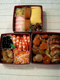 明けましておめでとうございます本年もどうぞ宜しくお願い致します12月中旬から残業続きの日々で完全にダウン状態のお母さんでした・・・ほんと、しんどかったのようちの会社は31日まで仕事で、【おせち】は家に帰ってから24時近くまでかかって作りましたよもともと私の実家は自営だったので年末年始なんて仕事・・・って感じで『うちのおせち』っていうモノがなかったの。でもおチビ達がだんだん大きくなってくるにつれやっぱり日本の伝統行事として教えて行きたいなぁ~って思ってちょっとずつ勉強してます・・・といっても、かずちゃんも私も普通に売られている【おせち】に入っているモノは食べれないものばかり数の子・昆布・頭の付いた海老・田作り・蓮根・酢の物・・・特に好き嫌いが多いのはかずちゃん。私とおチビ達が食べれるものは入れておいてかずちゃんの意見は半分無視じゃないと、入れるものがなくなっちゃうしね・・・そこで『うちのみんなが食べれる【おせち】』を検討中今年は前年と少し内容を変えてみました。平成19年度版 うち流【おせち】==========================『一の重』 錦玉子・伊達巻・紅白かまぼこ・栗きんとん・くるみじゃこ『二の重』 おなます・黒豆・イカのにんにく醤油焼き・海老のタルタル『三の重』 お煮しめ・チキンロールの照り焼==========================まだまだ初心者なので、錦玉子と伊達巻とくるみじゃこは市販のモノ。自分で作ったものは・・・ 栗きんとん・おなます・黒豆・イカのにんにく醤油焼き お煮しめ・チキンロール昨年よりは手際もよくなりましたが、料理本の味付けだと、やっぱうちには合わなかったり・・・だって。。。おなますが酸っぱすぎた私の実家へ行き、お母さんが作ったのを食べたらちょっと甘めでゴマが入っていておいしかったぁ~コレだよコレっって思いました。来年も31日まで仕事・・・って事は変わらないんだろうけど今度は錦玉子や伊達巻も手作りしてみたいと思います