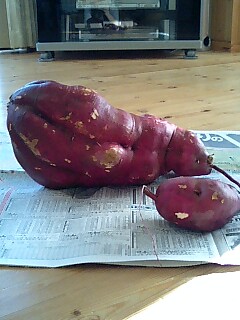 今週の月曜日におうまっくすの【祖父母参観】がありましたじいじが参加してくれたんだけど、きっと体力的にキツイだろうと覚悟を決めたらしいです・・・当日、午前中は何とかも降らずに済んでくれたので子供たちと外で遊んだり、遊戯室で遊んだり・・・とにかく2時間みっちりお相手してくれたそうです夜、じいじのウチにおチビ達をお迎えに行くとちょっとグッタリしていたじいじ。ほんと、お疲れ様でした・・・そして火曜日。年長さんの子達は祖父母参観で【いも堀り】に行ったようで掘って来てくれたサツマイモを、全クラスに配ってくれました。さわぞ~のクラスは先生が1人に1個ずつ、カバンの中に入れてくれたので小さめのかわいいサツマイモがありました。・・・問題は、やたらと重たいおうまっくすのカバンじいじもお迎えに行ったときに”いやに重たいと思ったんだけど、たくさん貰っちゃったのかねぇ~”なんて思ったみたいだけど、新聞に包まれたさつまいもを見た瞬間私もじいじもばあばも、大きいばあばも大爆笑こんなのが居ました・・・ 大きさの比較、分かりますよね???おうまっくすに事情を聞いてみると、”一番に取りに行って、一番大きいのを貰ってきたんだよ”って、得意満面の顔をして言いました”これをどうやって調理しろというのだ・・・ もう少し小さいのにしようと、 先生もなぜ説得してくれなかったんだ・・・”と、途方に暮れたお母さんでした。。。結局、ウチではどうすることもできず居酒屋をやっている私のお母さんのところへ持って行きました。その時も得意気に大きなさつまいもを披露するおうまっくすにフミちゃん(←私のお母さん)も苦笑い・・・きっとフミちゃんの手にかかれば、おいしいお料理に変化してくれるでしょうさつまいもにとっても、それが一番幸せだろう・・・ごめんね、私の手に負えなくてそしておうまっくす、やっぱりアナタは恐るべしっ