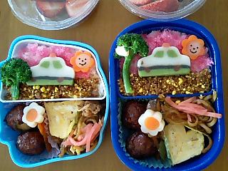 土曜保育なので、実は昨日のお弁当なんですが・・・やっと今日アップすることが出来ました昨日のお弁当のテーマは【トミカ弁当】です先週の水曜日、私のいとこ一家と一緒に静岡ツインメッセで開催中の『トミカ博』に行って来ました三3その後報告は、また後ほど・・・さてさて、お弁当はこんな感じご飯の上に乗っかってるのが、『トミカかまぼこ』。トミカ博で売っていたのをおうまっくすが発見そういうとこ目ざといんですよね~季節はもうすっかり春という事でパトカーでドライブ???ありえないけど、大好きなパトカーに乗ってる気分でご飯には鶏そぼろと桜でんぶを乗っけて木をイメージしたブロッコリーと、人参とじゃがいもで作った太陽昨日のおかずは・・・【肉団子の甘酢あん・富士宮やきそば・だし巻き玉子 イチゴ】お弁当はもちろん、おうまっくすやさわぞ~に大好評”ぴっかぴかの空っぽだに~~~”本当に洗ってきたんじゃないかってくらい、ピッカピカ嬉しかったですついでに、おうまっくすにサプライズを用意してたんです。 昨日から【カーズ】のお弁当箱に変えましたでもそれをおうまっくすには知らせてなかったので夜お迎えに行ったら大興奮お母さんとしては、そのリアクションにでした。
