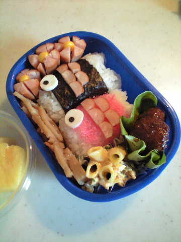 ずいぶんとご無沙汰してましたが、やっと少しずつ復活していこうと思います4月からおうまっくすも小学生になりました入って早々に色んな行事があって、お母さんもアタフタしてますそして5月1日には遠足。久しぶりのお弁当に少しはりきってしまいました。作ったお弁当の画像を取り忘れたので翌日が遠足の予備日となっていて給食が無かったのでその日に作ったお弁当を載せまぁ~すこの時期らしく、『こいのぼり弁当』です。お父さん鯉は海苔巻きで、お母さん鯉は桜でんぶで色づけうろこはウィンナーをスライスして、半分にカット。落ちないようにマヨネーズで接着しました目はゆで卵の白身の部分を丸く型抜きし、海苔を小さな丸にカットしたものをくっつけました。おかずは・・・【レンコンのきんぴら、照り焼き肉だんご、ウィンナー ペンネサラダ、パイナップル】保育園の時は、うちに帰ってくるなり「今日はお弁当ピッカピカだよ~~~」って言ってくれたけど、小学生になりちょっと大きくなったせいか私から「お弁当はどうだった?」って聞かないと答えてくれなくなりました。・・・なんだか寂しいですこうしてどんどんお兄ちゃんになってってしまうんですね。ちょっと戸惑いを感じているお母さんでした