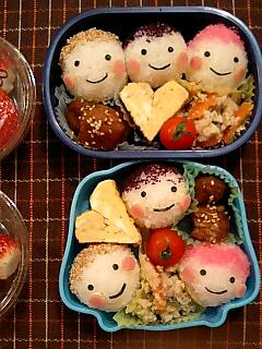 昨日の土曜保育のお弁当です♪仕事が忙しくってアップできませんんでした昨日はおうまっくすの【発表会】がありましたこんな12月の忙しい時期にやってくれるからかずちゃんは仕事だし、私も仕事を半休して参観見終わってからは急いで仕事へ・・・今日はそんな事で、土曜保育に来る子供たちも少なくてちょっと淋しそうでした今朝はいつもより早く起きて、気合を入れてお弁当を作りました今日のおにぎりは【ゴマ男くん・梅太郎くん・アフロちゃん】と命名しましたゴマ男くんは、中に鮭フレークが入っていて頭に白ゴマをまぶしています。梅太郎くんは、中に小梅が入っていて頭にはゆかりをまぶしました。そして、アフロちゃんの頭には桜でんぶがついています。みんなのほっぺには、ハムを丸く切ってマヨネーズをちょっと付けて落ちないようにくっつけました昨日のおかずは【うの花煮・だし巻き玉子・あんかけ団子・ミニトマト いちご】いちごは今シーズン初だったからおチビ達も大喜びでした昨日のお弁当もきれいに食べてきてくれましたありがと~~~