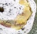 小麦堂ベーグルズ さんのお試しセットから黒ゴマとおイモのベーグルです~♪色白ベーグルのうえ一部分に黒ゴマがついていて見た目がとっても可愛い。なかにはサツマイモの角切りがゴロゴロ。これが甘露煮になっているのか甘めなので嬉しい