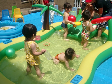 今日は8月に3回ある乳児広場のプールの日でした。なんかゴージャスな感じでおしゃれなプールにママは大感激。合計4つのプールが用意されていて子供用のかわいい椅子が並べてあったりラブリー♪でママはこんなにしていただいてと感謝しました。うちの子はまだ水着を持っていないので水遊びパンツの上に洋服でした。途中プールから上がって着替えて乳児広場の運動場とかに行く子も多かったのにうちのこは しつこく・・・最後までプールで遊びました。終わった後ひっくり返って泣くのでは?と心配でしたが設置された外のシャワーが気持ちがいいのか大喜びでした。でも着替えさすのが大変。ジュースでおびき寄せ成功しました。楽しい水遊びが終わって今爆睡しています。こんなによくしていただいて本当ありがたいし助かりました。職員のお兄さん方ありがとうございました。来年は水着を買ってあげようと思います。今年は水遊びパンツでごめんね!笑。小さい子の水着 いろいろ 夏を楽しみましょう。