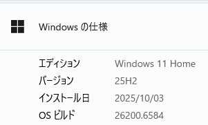 購入から10年たったノートパソコンBlogランキングに参加してま~す よろしければクリックを普段はspacedeskを使ってメインマシンのサブディスプレイとして使ってるんだけどいつまでたって24H2のアップデートが来なくてそうこうしているうちに25H2がリリースもの試しに25H2をインストールしてみたなんじゃこりゃって感じでエラーも発生せずあっさりインストール完了ちなみに余りに遅いので普通のパソコンとしての実用性は全くありませんがw Blogランキングに参加してま~す よろしければクリックを 楽天トップへ