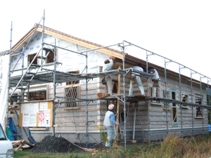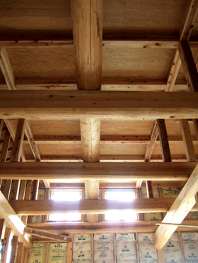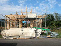 先日打ち合わせをした時に、玄関の上に梁をつけてみないか?という親方さんからの提案があって自分たちは見せる梁が好きなので是非付けてもらうことにしました。そして29日(土)その作業が行われました。コレがけっこう難儀で・・悪戦苦闘の末取り付け完了!ちょっと和風な感じがしますか?玄関にずっしり感がでましたっサッシ・ガラスはだいたい付いてきました。(サッシ) 今週はいよいよ外壁材が張られる予定です。