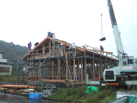 屋根の下地材が張られていく様子を眺め・・・クレーンでルーフィングを吊っている 作業はちゃくちゃくと進む・・・ 雨の中の棟上になってしまいました。 今日は大工さんのほかに 水道屋さん電気屋さんクロス屋さん建具屋さん塗装屋さん 屋根屋さんクレーン業者さん、など13名の方が集まって作業してくださいました。 雨に濡れながらの作業本当に申し訳なかったです。 作業が終わる頃には雨も止み・・・タイミング悪し。 今日は朝7時すぎから現場が始まって終わったのが午後2時半頃。 予想外に早く終わりましたが今日もまた一段と進みました^^*。
