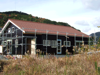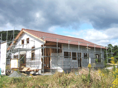 屋根の工事が金曜から始まり、2日間でほぼ全面張られていました。この写真ではちょっと分かりにくいかもしれませんがこの屋根材とてもイイです。品名がナチュレオレンジとありますが実際ついたのを見ると落ち着いた赤い屋根といった感じです。瓦だからずっしりとしていて安っぽくなく色の雰囲気はアンティーク素焼な感じ。まだらな具合もよい、。もう自分のイメージにピッタリ。これにしてホント、正解でした^^*)。 クボタ松下電工外装(株)