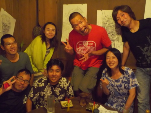 さて、3日目の夕方本日の予約っちゅぅんをチラッと見るとアニヤ様とある宮古ラグビーの仲間で首里在住の同姓の友はおるんじゃが予約時に人数と名前しか言ちょっちゃぁなかったとのことアニヤンならわしが来ちょるかどうかとか尋ねるじゃろし違うんかと思ぉちょったんが、夕方現れたんはそぉ!当人!アニヤン!エロニアン!高校の同僚せんせ達と来てくれたんちゃ聞きゃぁこの楽天ブログに書き込みしたとのことそんなん出張中に見る術なしの須磨帆携帯嫌悪難儀おやぢまぁええちゃそのおかげで喜び数倍!アニヤン!ありがとー!そぉそぉ、わしのホームステイ先のリョーも参戦ありがとー!土曜は大阪からNPOヒーローズ理事のニッシーから早めのご予約なんと!わしらの展覧会だけのための来沖!翌朝一番で帰阪!恐れ多いことっちゃぁ~しかも!大阪の自宅から石嶺食堂まで1200円で来ちゃったんちゃ??家から難波まで折り畳み自転車難波からラピート、で1200円関空から那覇までマイル使用空港から首里までまた自転車恐るべし!しかも、ユキの器もお買い上げ~ユキの三線仲間のカワちゃんも川崎からで、お買い上げ~ユキのぐい飲みで乾杯に本人大感激感涙そんな宴会に常連さんで唄者のズケちゃんも参入最後はカチャーシーで大騒ぎ女将!ごめんよ~タクシーで於茂登まで戻って駐車場でやっちょる屋台で二次会3時まで自転車を組み上げてホテルへ戻る理事ニッシー無事にホテルへ、大阪へ帰られたんじゃろぉかのぅ、、、ありがとね~最終日はほとんどお客なく女将チアキから店のあれこれ大将のあれこれじっくりまったり聞けてこれはこれでグ~じゃったのぅはぁ~みなさん!ほんとにほんとにありがとさんでございました!中盤はわしらおりませんが作品は自由に観て購入できますけぇで!後半戦!26から30までのんもよろしく~!ユナイテッドピープル基金 東北関東大震災 緊急支援クリック募金