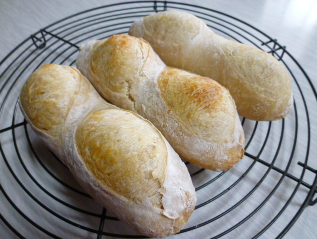 この前のカンパと同じ日に時間をずらして仕込んでいたレーズン酵母で「ちびバケット」も焼いていました♪ 本のレシピでは4本の分割だったけど、3本にしました。このちびバケットは、クープも2本だけなのでクープが下手な私には助かりますちょっと焼き色が薄かった、、。 お粉はメゾンカイザートラディショナルで。 ひび割れしてるのはなんでなのかな?まだまだ修行が足りません レシピはこちらの本で 【送料無料】天然酵母...価格:1,260円(税込、送料別) ランキングに参加してますクリックしていただければ嬉しいです↓ ↓ ↓にほんブログ村