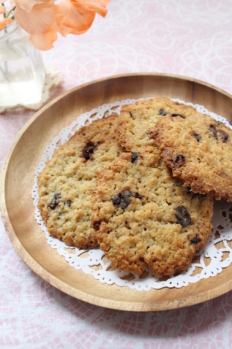 大分前に買っておいたオートミール、期限が近くなっていたので慌ててクッキー作り ^^;チョコチップとクルミを入れたオートミールクッキー。大きめなアメリカンタイプで外側はサクッとして中は少ししっとりした大好きなクッキーです♪こちらもバレンタインの友チョコにもおすすめですね(*^─^*) 娘と息子がいた頃はたまに焼いていたクッキーでしたが、この頃は焼く事もなくなりたまに食べたくなるとお店で買って食べたり ^^ 久しぶりに焼いたクッキーは美味しくて何枚でも食べれそうでしたが、カロリーを考えて1枚で我慢です 笑 ★★★チョコとクルミのオートミールクッキー♪★★★ ★材料 (約9~10センチで12枚くらい焼けます)・無塩バター ・・・・ 200g・お砂糖(お好みの物で) ・・・・ 60g・卵 ・・・・ 1個(溶いておく)・薄力粉 ・・・・ 60g(振るっておく)・オートミール ・・・・80g・お塩 ・・・・ 少々・バニラエッセンス ・・・・ 少々・チョコチップ ・・・・40g・クルミ ・・・・ 20g(ローストしたものを細かく切っておく)★作り方1、ボールに柔らかくしたバターを入れてお砂糖を加え泡だて器でなめらかになるまですり混ぜ、 卵を少しずつ入れてその都度よく混ぜます。2、1にお塩、バニラエッセンス、薄力粉、オートミール、チョコチップ、クルミも入れて ゴムヘラでよく混ぜ合わせます。3、2を大さじ2くらいずつオーブンシートをひいた天板におき上からスプーンで少し押して 平らにし、バターが溶けて広がるので間隔を置いて並べ170度に温めたオーブンで 18分くらい焼きます。 ※焼き時間はオーブンによって変わります4、焼き上がったらそのまま触らずに冷めるまでおいて下さい。ふたつのランキングに参加中です、応援クリックしていただけると嬉しいです☆にほんブログ村