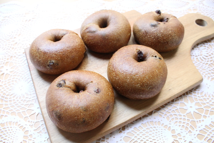 レーズン酵母の元種で焼いたコーヒーレーズンベーグル♪もっちりのベーグルがたまに食べたくなります。初めはシナモンレーズンにしようかと思っていたけどコーヒー味に変更 ^^;いつもより少し発酵させ過ぎてしまいむっちり感は少なそうな気配 ^^はちみつ入りのお湯でケトリングしてからオーブンへ。シワシワだった生地がこんなにぷっくら焼けてコーヒーのいい香りもしてます♪半分にカットしてお味見。口の中でほろ苦いコーヒー味の中にレーズンの甘さに出会えた時の美味しさがたまらなかった♪下のバナーをクリックしていただけると嬉しいです☆