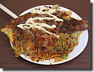 小麦粉を溶いた生地の上にキャベツ、紅しょうが、コーンetc...そして、肉でフタがしてあります。マヨネーズはお好みで。しめて500円☆