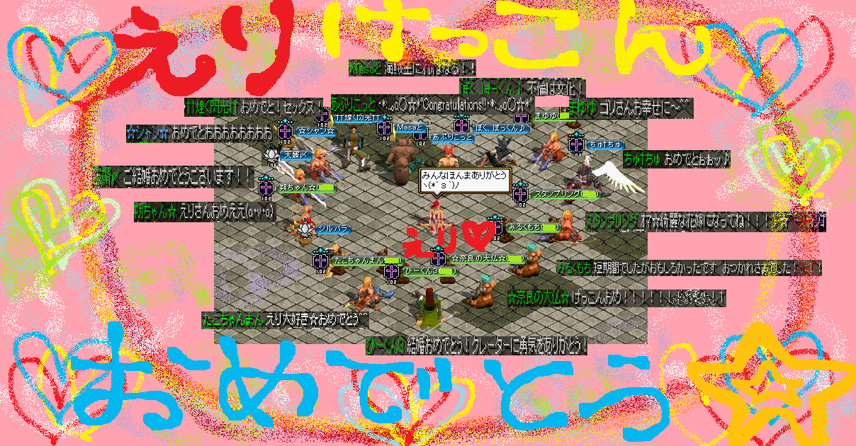 コンニチワ━━( ´・∀・`)ノ━━!! 気づけば前の記事から1ヶ月近くたってましたwwすいませんwwww もっとネタ提供お願いします 先週の木曜日にあったアップデートの「ワンタイムキー」の効果なのか、今のとこはハック情報はないですね!よかったのかわ分かりませんが、一安心ですヽ(´ー`)ノ 今回わおめでたいメドレーで行こうと思います(d゚ω゚d)オゥイェー♪ まずなにかな・・・w 10月の終わり頃に、ある人が引退野生に帰還しました( ´ー`) まぁもう知ってるかと思いますがw「ωエロコω」ですね^^ ここはもう前ふりなしでいいかと思います( ^ω^) ↑はたこちゃんまんの力作。よく頑張ったマジでwww 寿引退おめでとうwお幸せに^^ こっからメインイベント。ブログをサボってた理由はこれなんだぁあああああ!!! たしか前回ブログを書いてた時は、僕のランサはまだlv680とかだった気がしますw だが?僕はがんばった。秘密にいきつつも頑張ったんだ!!!!! ん?経験値があと1?なんだなんだ・・・あぁたまたまなのかな、うん! ヾ(゚∀゚)ノパッ 説明しよう。 僕は1週間くらい本気で狩りしてたんだ。何年ぶりだろうかくらいwそんでlvが699と経験値1まで頑張ったんだ。この日のために!!僕は人を集めた。見てもらいたかったからヽ(´ー`)ノなぁんが先に来て、なんとなくPTを組んだんだよね。ホントなんとなくwそれで待ってたんだみんなを。 そしてふと目を離してたら・・・あれぇ恩寵がでてるwまぁいっか・・・ん?ん?んんんんん??? あれ700?ん?恩寵・・・ん? あとわ察してもらおうかな^^続きはあとで って感じで、大事な700は一瞬でしたwwwwwwwwwwwwwwww そっから数名来てくれてヽ(´ー`)ノ こうなって こうなりましたw みんなありがとうヽ(´ー`)ノ楽しかったし嬉しかったし文句なしです♪おんぶもしたしな 多少雑談してワイワイが終わったから解散しまして、そしたらいろんな人から耳きましたw ありがとうヽ(´ー`)ノ あとねぇプレゼントももらったんだ!ちょっと嬉しかったwww ケーキ700個はとっても重かったです(;^ω^)それをバカ食いしながらあままんにももらいましたヽ(´ー`)ノ ありがとう(o´∀`) どんまいwwwwwwwいろいろ手伝ってくれたし許すおwwwwwwwwww だから天上界お願いね ホントここ最近はいい話がなくてしょんぼりしてたけど、まだまだやっていけそうですね!いい人達ばっかだゥヮ―。゚(PД`q*)゚。―ン これからも仲良くお願いします!wそれじゃあこの辺で^^ ここからわポルマンに。 出会いは天上だったね!僕にとってあこがれの人リストwに入ってた人だったので 今じゃ仲良くなれてホント嬉しいですヽ(´ー`)ノ くだらないことも真面目な話もできるポルマンわすごいと思いました!ホント尊敬です>< いろんなことを教えてもらいました( ´ー`) 引退するからもう連絡とれないとかそうゆうさみしいことは考えないでまだまだ絡んでいきたいと思ってますb ポルマンファイト━━(ノ゚д゚)人(゚Д゚ )ノ━━!! 以上ですv