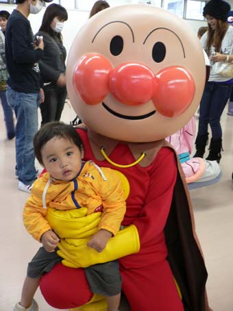 今日も別の住宅展示場でアンパンマンショーがあることを発見今日は旦那さんと一緒に出陣(笑).アンパンマンショー開始30分前から雨が降り始めました.「ショーがない・・・」としょげていると「握手会と撮影会を行います」というアナウンス.昨日よりも参加人数が少なく,時間もたっぷりありました.や,で撮影.アンパンマンに抱っこされて固まるポコちゃん.大好きなバイキンマンでもカチンコチン.なぜ顔をそむけているの?・・・と思ったら,ギュッと抱きしめていました.最後に集合写真もバッチリ撮れました旦那さんも私も大満足