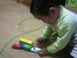 ポコちゃん,お遊び真っ最中ミニカーを並べて・・・とにかく並べて・・・アンパンマン人形を乗せて・・・これで完成少し走らせると,人形は落下それでも飽きずに何度もチャレンジ頑張れ,ポコちゃん