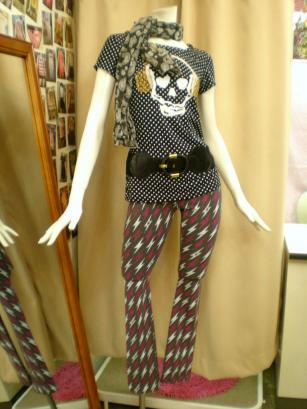 今日は・・・・・・・・とっても眠い”みとぅ”だよ昨日のウィンドウの画像だよスカル柄のTシャツは昨日紹介したよね\1,995ストールは\2,205ベルトは\1,995稲妻柄のレギンスは\1,995だよレギンスをズ~ムUPこんな感じかっこいいでしょあと今日トレンカが入荷したよこれは厚手タイプで\2,415こっちはすぐ乾くさらさらトレンカ\1,995まだまだ新入荷たくさんあるよ時間があったらUPするね じゃ