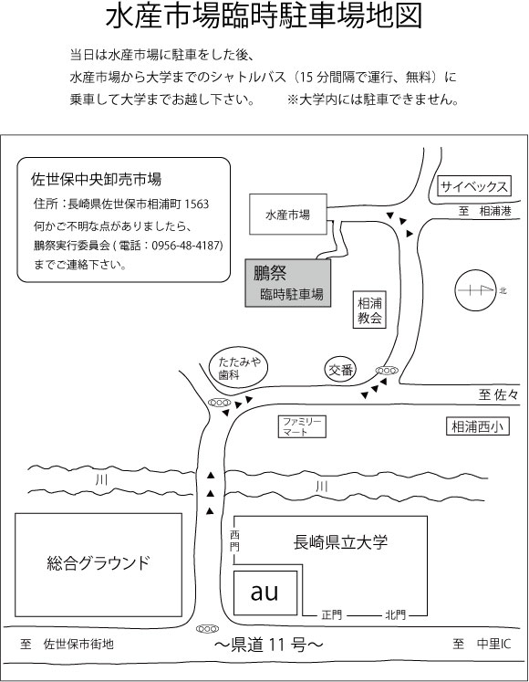 鵬祭にご来場されるお客様へ 鵬祭では、駐車場の数に限りがありますので、できるだけ公共交通機関をご利用されるか、水産市場臨時駐車場をご利用下さい。 長崎県立大学鵬祭への交通アクセス方法は<佐世保駅~大学まで> ・MR佐世保駅より乗車し大学駅で下車徒歩5分 ・市営バスで30分 →JR佐世保駅前の市バス停留所で日野経由または日野大潟経由の相浦桟橋行、 真申(まさる)行、小野住宅行 のいず れかに乗車し、大学前下車 ・西肥(さいひ)バスで30分 →JR佐世保駅前の西肥バス停留所で、日野経由の相浦桟橋行、大崎行のいずれかに乗車し、大学前下車 ・タクシーで20分 です。 水産市場臨時駐車場の地図は以下の通りです。 楽しめることまちがいなし! 皆さんのご来場、スタッフ一同お待ちしております。 鵬祭実行委員会