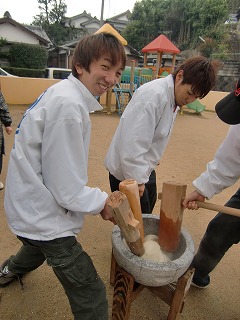 こんにちは!最近寒いですね~本当コタツから出れない今日この頃です。こんな寒い中ですが私たち実行委員は、12月1日に日野幼稚園の餅つきに行って来ました餅つきというのは、餅をつく、タダそれだけなのですがなかなかむづかしい・・・・力を込めてペッタン。大人の方もペッタン。ペッタン。子どもと一緒にペッタン。ペッタン。ペッタン子供たち全員で、ペッタン。ペッタン。ペッタン。ペッタン。ペッタン・・・ペッタン・・ペッタン・・・ペッタンぺぺぺわーーーーーーーーーーーーーーーーーっとずっと餅つきやりました。私たちはバテましたが、大人の方は余裕そうでした流石です・・・子供たちも喜んでくれて、皆満足な餅つきでした美味しい料理も食べました自分たちで付いた餅はサイコーでした!日野幼稚園の方々ありがとうございました