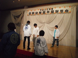 こんにちは。三日前の19日は日野幼稚園謝恩会がありました。僕たちは日野レンジャーをやりました。練習風景です。控え室の様子です。子ども達も頑張って踊ってました。今回はじめてレンジャーショーをやってみたんですがやはり緊張するものですね^^;でも楽しかったです。子ども達と別れの様子は感動しました(;_;)担当 S,A