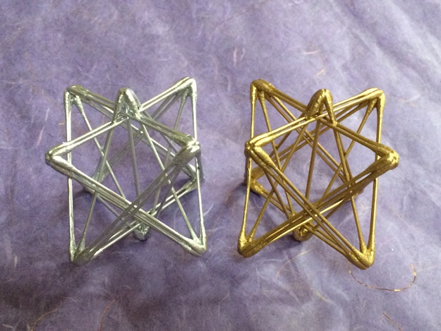今日の掲載画像の造形は、今朝になって『ひびき』と命名した作品である。この『ひびき』という作品は、片手で持てる「手のひらサイズ」ということから、実際に左右の掌に乗せて体感することを想定して、金色と銀色の陰陽二種類(同型・同寸)を制作し、これを並べて撮影したものだ。そこで以下の文章は、かつて自身のホームページで綴っていた《作品の概要》である。・2つの正4面体を和合した星型8面体の中央に、天地を貫く御柱として軸を立てた作品です。・かわいい手のひらサイズの2種類(同型)の作品で、金色と銀色の装いでの披露となりました。・造形の中心から天の四方と地の四方の八方位に、天地を加えた「十方位」を表現しています。さて以下の関連記事にあるように、この造形については「数と形の関係」から「11」という数を意識してきた。つまり、0から10までの「11」個の数が展開する「十進法の数理」を、この造形の構造性に纏わる「はたらき」として認識してきたということである。☆関連記事・2007年11月20日・・・「11」を観る・・・⇒リンク そこで本日、まるで「11」という数に連関するかのように、「ひふみ神示」の五十黙示録〔至恩の巻〕にある記載内容が気になったので、以下に転載しておきたい。第十五帖・・・神の申すことは一分一厘違はんのであるぞ、今度言ふことを聞かねば大変な気の毒となるぞ、地(智)の下になって了ふのであるぞ、12345678の世界が12345678910の世となりて、012345678910の世となるのぢゃ、012345678910が【マコト】と申してあろうがな。裏表で二十二ぢゃ、二二の五ぢゃ、二二(ふじ)は晴れたり日本晴れぞ、判りたか。・・・以上の記載内容のなかで、特に・・・「1~8の世界」が「1~10の世界」になって・・・の部分が、この掲載画像の造形に深く関連するところではないかと感じる。つまり、「1~8の世界」が「1~10の世界」になるには、既存の「1~8の世界」に「9」と「10」の2つの数が加わることを意味しており、その加わる2つの数こそ、掲載画像の造形の「天地を貫く御柱」たる中心軸の「天(9)」と「地(10)」の2つの方向に対応していると思われるのだ。つまり既存の「マカバ(星形8面体)」の8つの頂点が示す「1~8の世界」に、天地の2つの方向が加わって「1~10の世界」となることが・・・「1~8の世界」が「1~10の世界」になって・・・ということであり、その天地を貫く中心軸の「真ん中」を「0」として加えて・・・「0~10の世界」となり、これを「マコト(〇九十)」という・・・となるのであろう。ということは、「11」を象徴する金色と銀色と、陰陽(表裏)の2つの造形が揃うことで、「11」足す「11」で「22(二十二)」となり・・・二二は晴れたり日本晴れ・・・と、実に見事に神示との関連性が伺えたのは不思議である。もしかすると、この金色の「11」を象徴する『ひびき』を左手に持ち、そして銀色の「11」を象徴する『ひびき』を右手に持って瞑目し、金銀を超えるプラチナ色を「ハイハート・チャクラ」にイメージしていると、加えて「22」の「太陽系の次元」を越えていき、いよいよ「23」の数が象徴する「シリウス次元」に意識転換できるかも・・・。