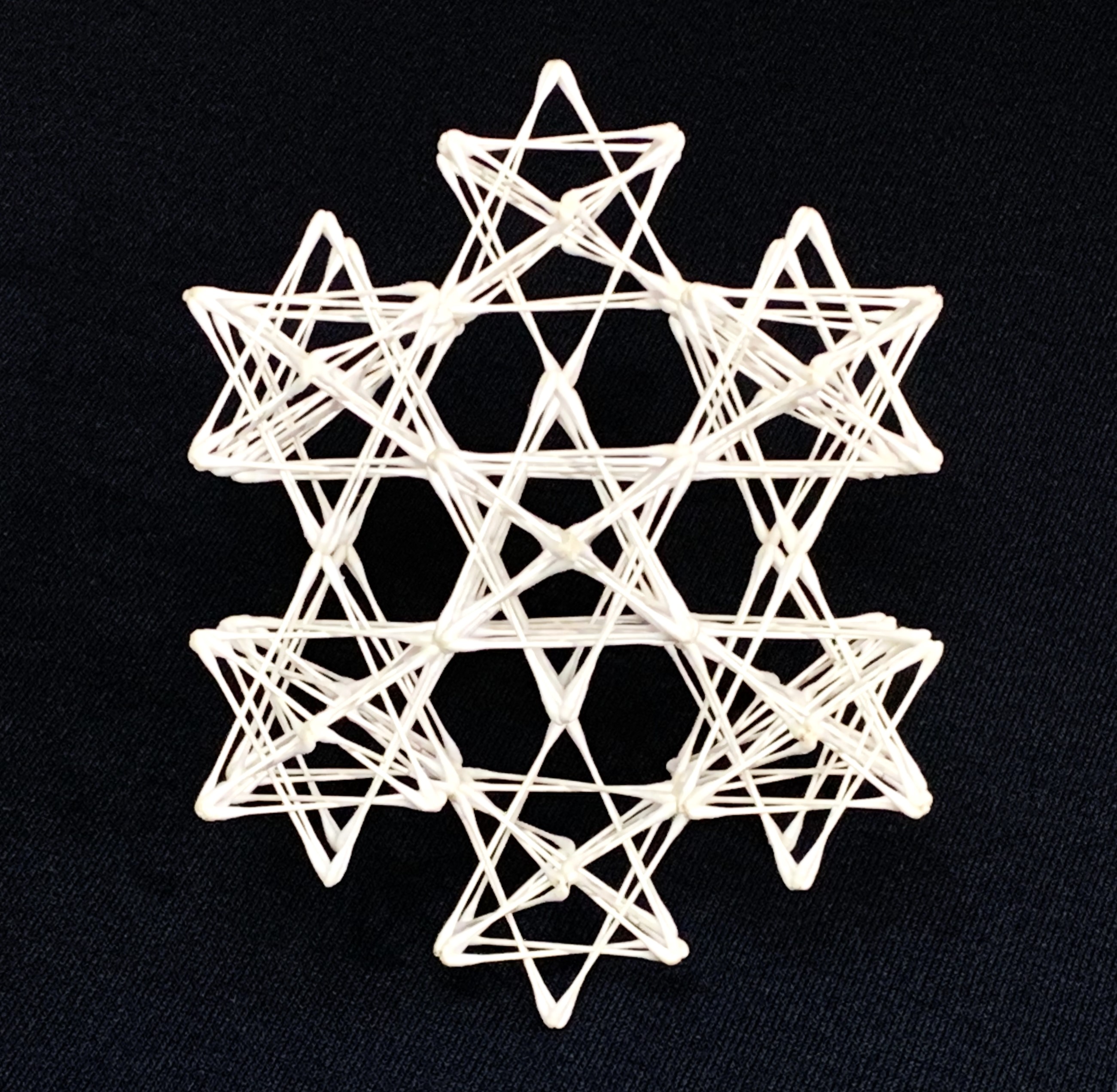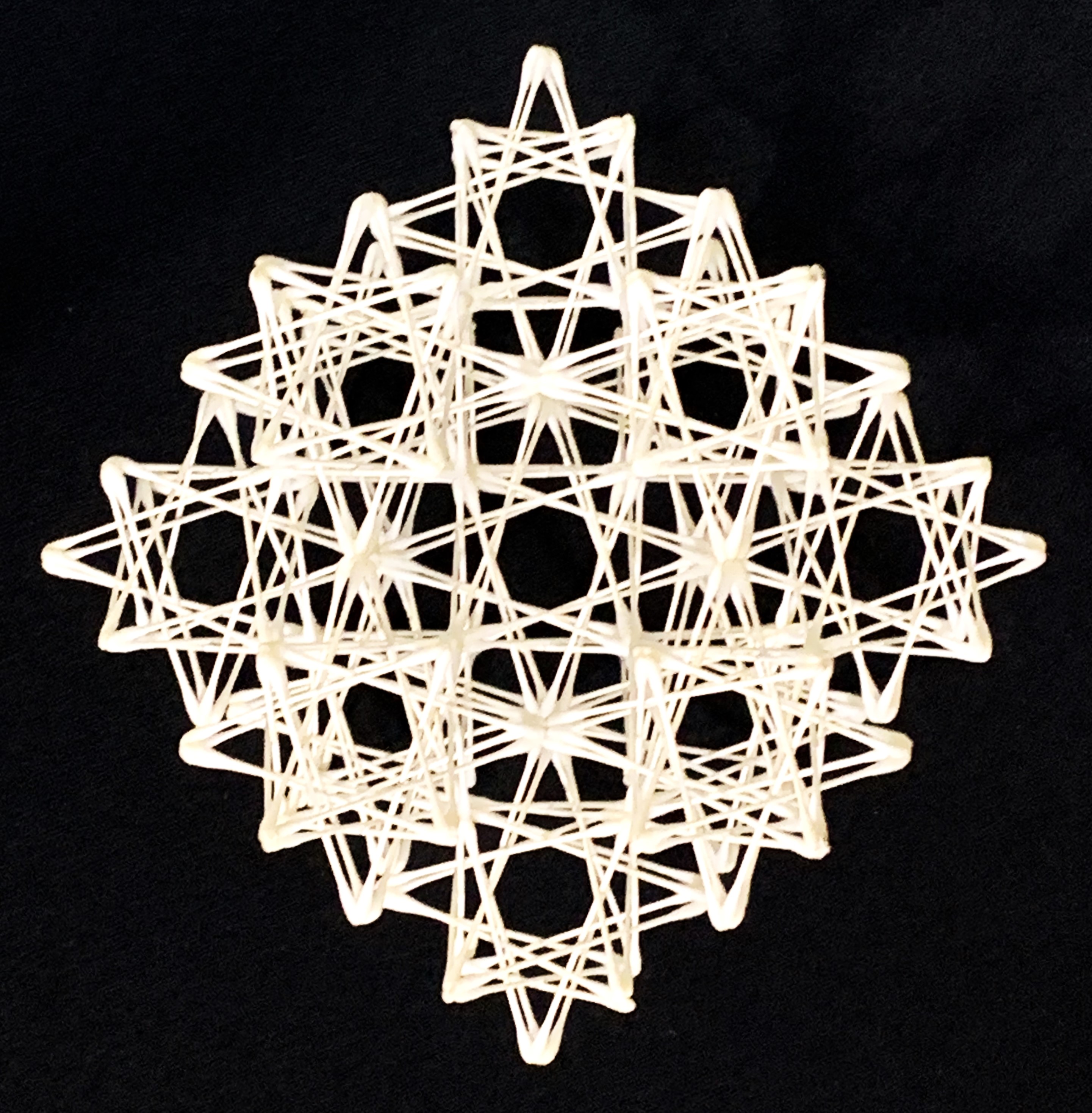 さて、いよいよ本題の【フラワー・オブ・ライフ (立体) の”縮小版”】の制作に入るわけだが、冒頭画像に映る「小・準正14」(構成単位)を計13個つくり、法則性に基づいた配置によりバランスよく組み上げた作品を撮影したものが、この上下2枚の画像である。