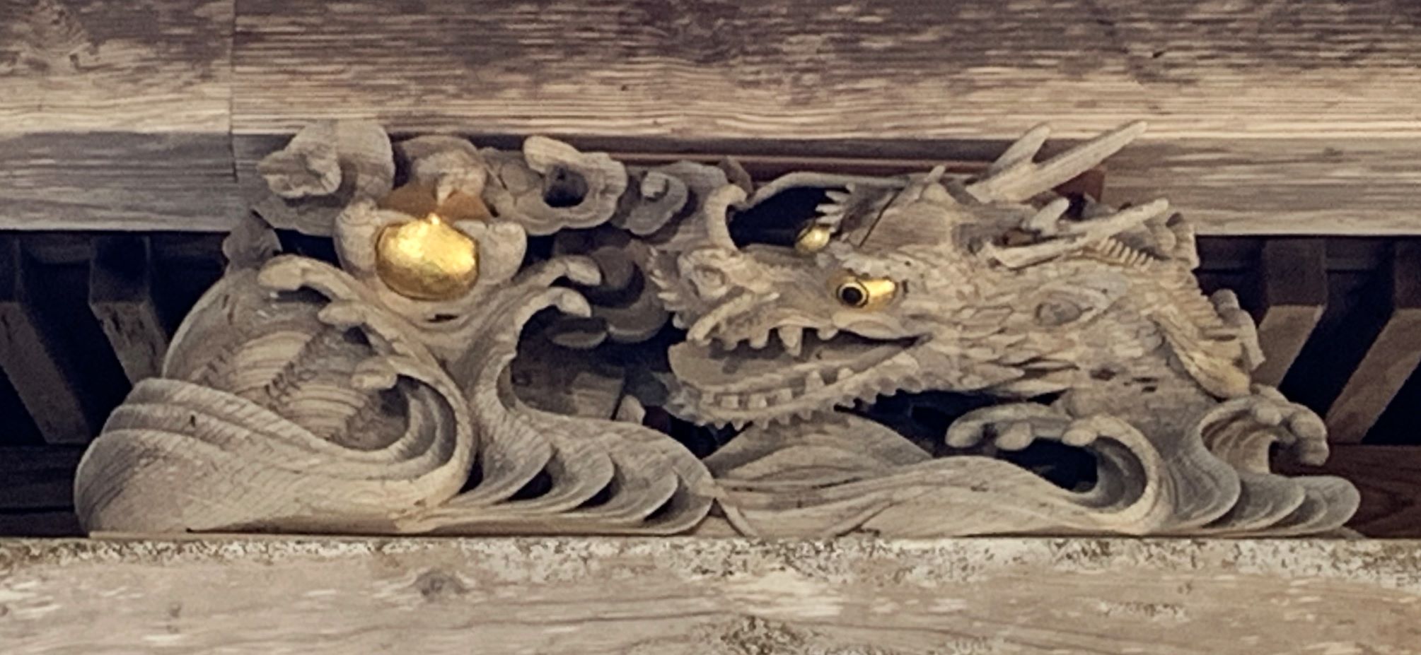 そして、当社に参拝し拝殿の上方を見上げると、上の画像のように「玉を手に持つ龍」の立派な彫刻が目に入った。