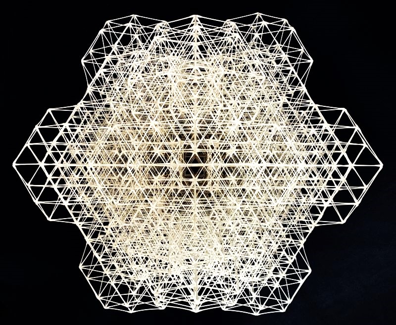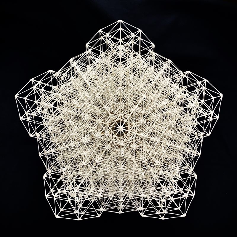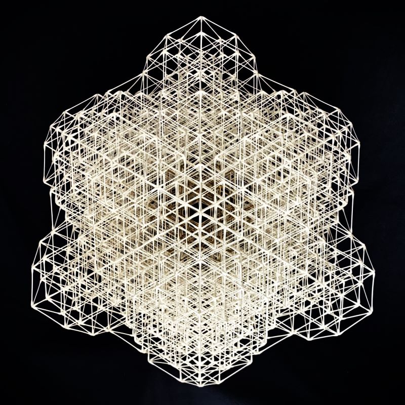 上記の解説では、この造形の構成単位を「菱形30面体(6次元立方体)」としてきたが、言うまでもなく究極の構成単位とは《同じ長さの軸線(綿棒)》である。