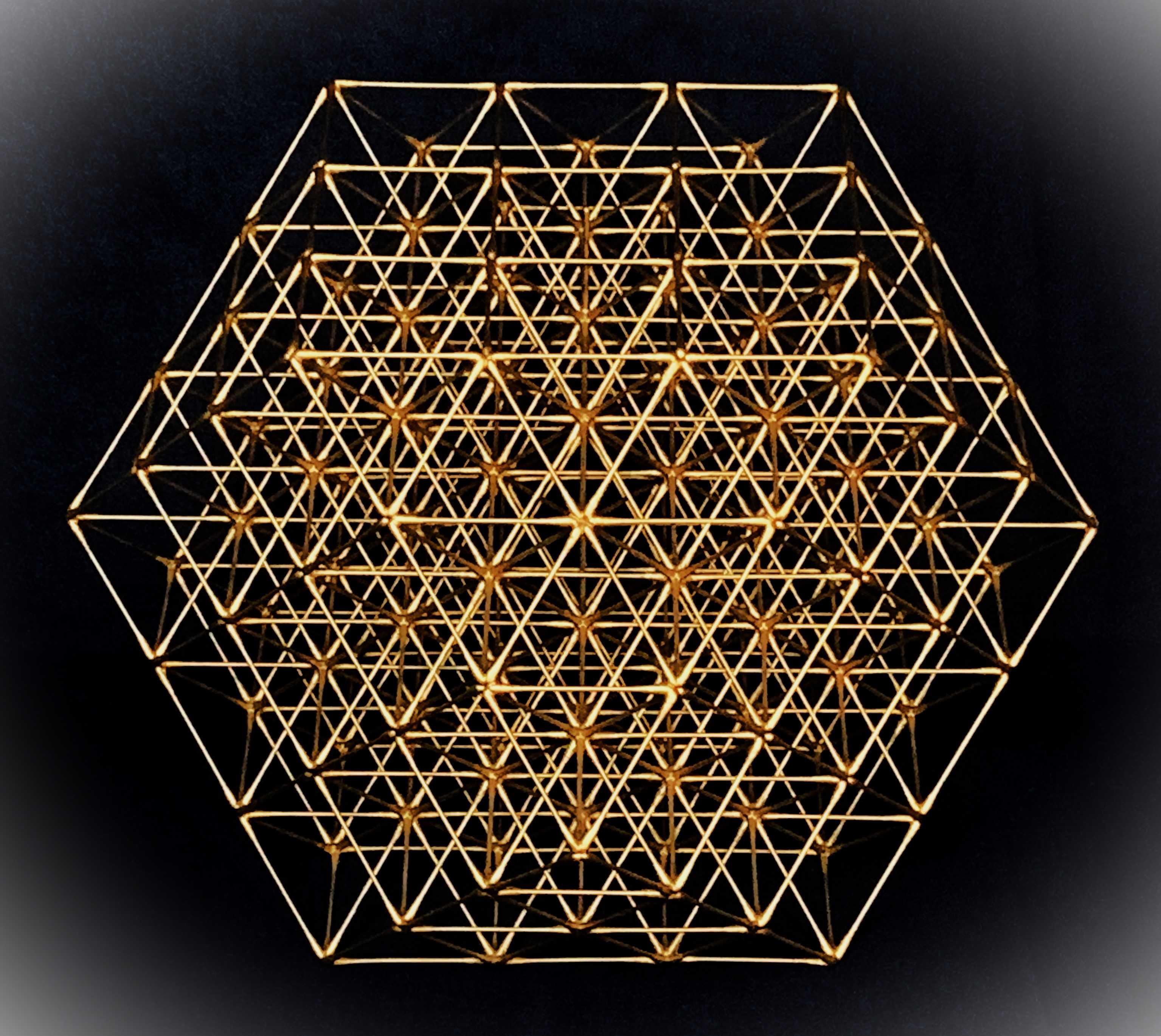 )を全部で13個組み合わせたものを基盤に制作した作品で、結果として中央に存在する1個の「準正14面体」から外側に向かって〔三層構造〕に展開した複合立体である。