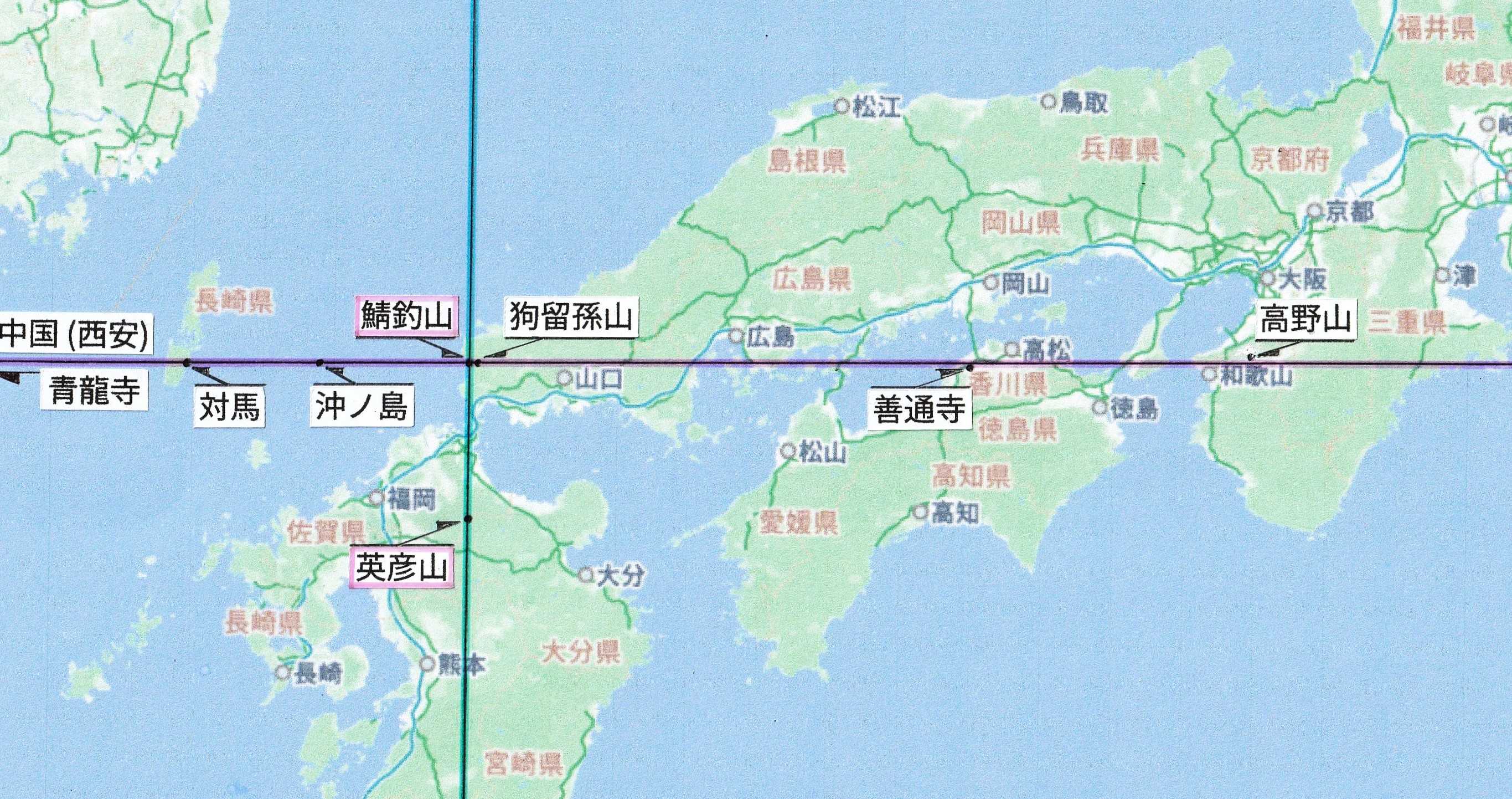 実は”ある仮説”に・・・〔空海〕は〈太陽の影〉を利用して、かなり正確な緯度を測定する測量方法を承知の上で、真言密教を修得した中国の長安(現在の西安)の「青龍寺」を西方の基点とする「北緯34度13分」の東方へ向かう緯度線上に、〔空海〕の生誕地とされる香川県の「善通寺」 (北緯34度13分30秒) や真言密教の聖地「高野山」 (北緯34度12分50秒) を意図的に配置したのではないか・・・とあった。