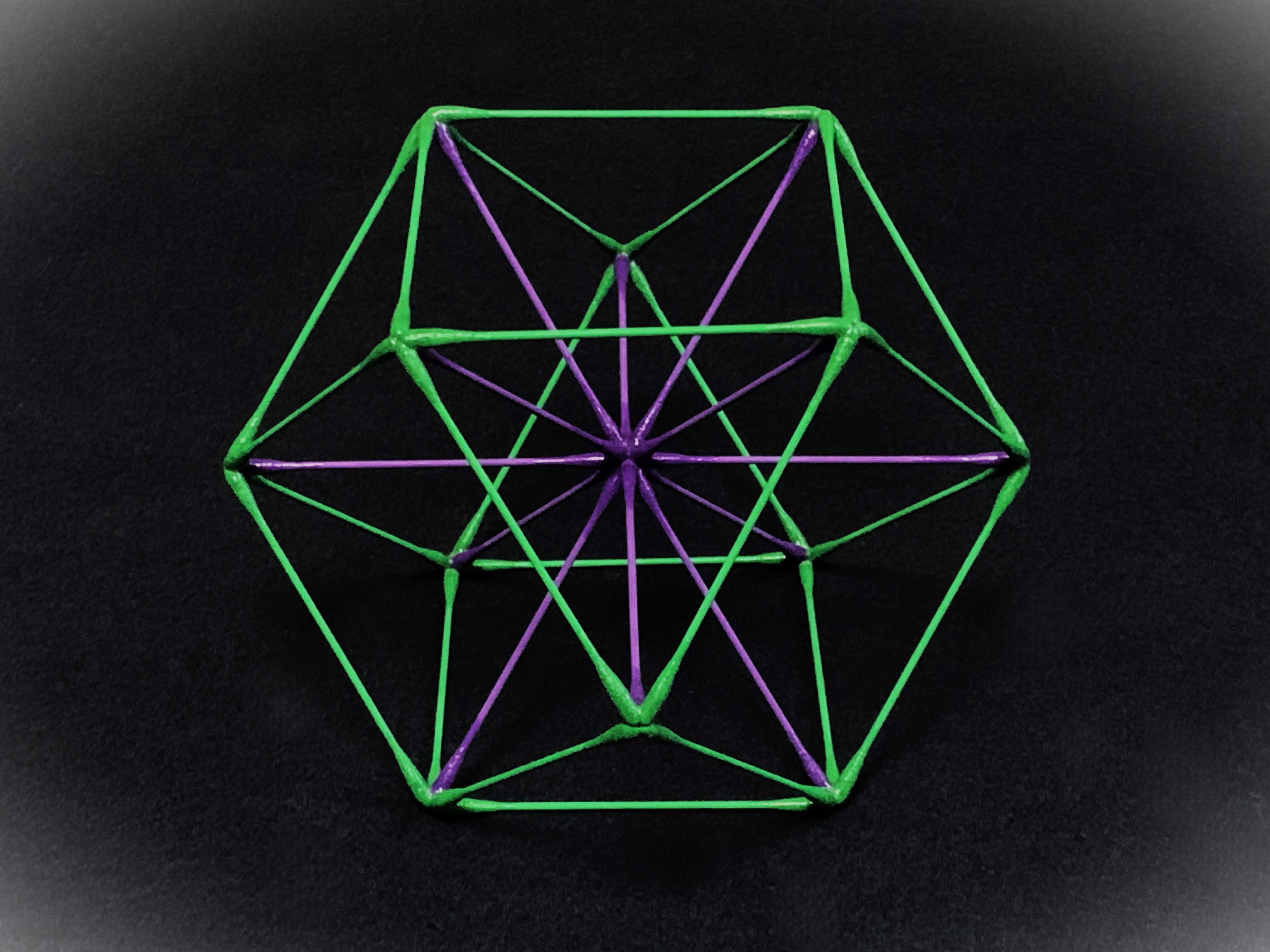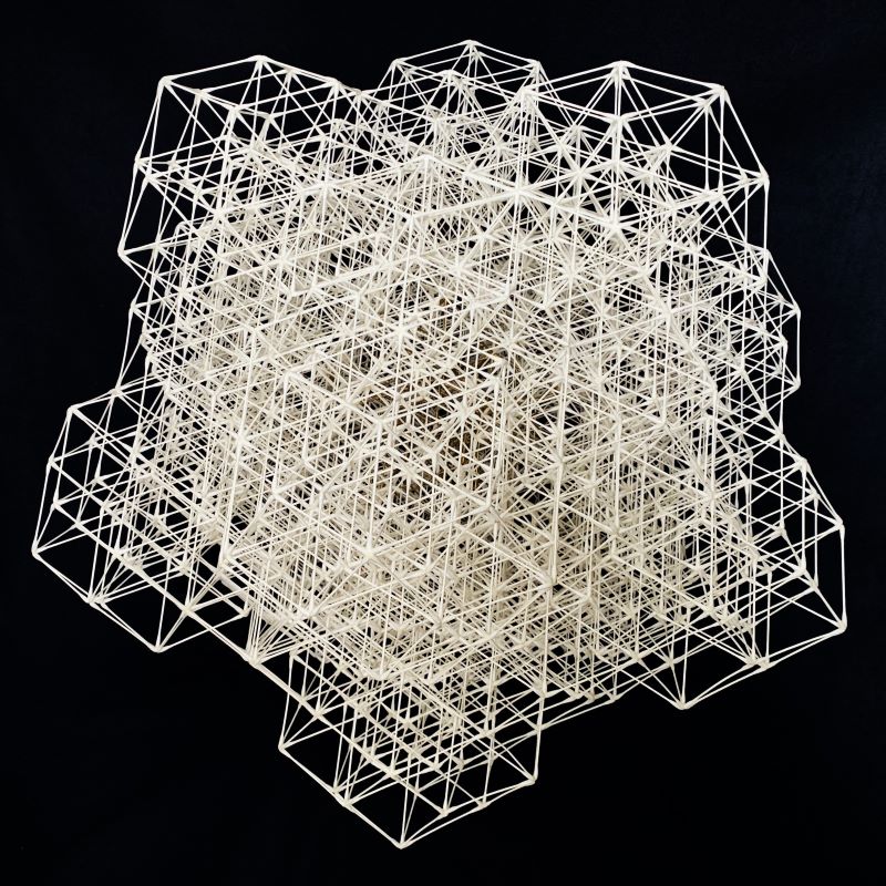 本日の冒頭画像は、今年3月の初旬より約1ケ月かけて制作に取り組んだ大作の全体像を撮影したものだ。この造形の構成に必要とした「軸線」(素材は綿棒)の総数は、おそらく5,000本は越えている。だがしかし、作成の途中から数えることを止め、久しぶりの大作となる造形の制作に無我夢中になるのであった。今回のタイトルを縮めた”多次元転換構造”というのが、この造形の名称としたいところだが、つまり”あらゆる次元にアクセスできる可能性を秘めた構造体”という意味合いで、私的には《 9次元立方体 》の造形表現を目標に制作に取り組み、その具現化に漕ぎ着けた思われる造形を公開したということになる。この冒頭画像に映る造形は、一見すると複雑すぎて分かりづらいと思うので、以下に掲載した画像に映る造形等を参考に解説を試みたい。冒頭画像に映る言わば「多次元的構造」は、この上の画像に映る「6次元立方体」(菱形30面体)を構成単位としており、全部で〔33〕個の「6次元立方体」を抱合し構成した造形表現となっている。当初は予めその〔33〕個を想定して制作し始めたのではなく、この「多次元的構造」(※9次元立方体)を構築するにおいて、結果的に〔33〕個の「6次元立方体」を必要としたことについては、自分でも興味深く注目したいところである。※(ここで「9次元」と記しているが、その”次元の数”が多くて解説も難しいことから、本日のブログタイトルのように「多次元」と表現することにした次第)☆関連記事・・・遺跡巡りの果てにたどり着いた「美しき構造」についてそこで上のリンクは、今から約20年前に始めた当ブログでは最初の記事だが、その冒頭画像に映る造形が「菱形30面体(6次元立方体)」の軸線構成であった。実はこの「6次元立方体」という別称のある「菱形30面体」を構成単位とし、より高次に次元を転換し模索するという類推より、冒頭画像の(私的解釈による)「9次元立方体」は、なぜか今年の3月を迎えて自身の脳裏に忽然と浮かんだのであった・・・。☆関連記事・・・《 菱形30面体 》の本質的構造この「9次元立方体」に関する立体の制作については、かねてより意識していたのではあるが、その制作に向かう契機となったのは、(今から約1年半前となるのだが)ある造形制作に詳しい知人に上の関連記事の内容を、軸線構成による「菱形30面体」の実物を披露しつつ解説したところ・・・その流れで「9次元立方体」の制作にチャレンジてみてはどうか・・・とのアドバイスを受けていたという経緯があった。そして、それなりの期間を経た今、桜の満開の季節に『9次元』という”大輪の花”を咲かせるとができたことは、制作者として感慨無量である。次にこの”多次元構造”を把握するための、〔3つの側面〕を映した画像を解説しておこう。まず上の画像は、まさに”満開の桜花”たる風情であるが、冒頭画像の造形を「五角形(五芒星)」系に見える角度から撮影したものだ。次に上の画像は、同じ冒頭画像の造形を「六角形(六芒星)」系に見える角度から撮影したものである。ここで大切な観方と思われるのは、上の2枚の画像を見れば明快なのだが、この一つの造形には「五角形(”火”の字形)」と「六角形(”水”の字形)」の言わば「陰と陽」の要素が和合し共存しているということだ。そして下の画像は、この造形の構造性を最も本質的に示すであろう”3番目の側面”を撮影したものだ。上記の解説では、この造形の構成単位を「菱形30面体(6次元立方体)」としてきたが、言うまでもなく究極の構成単位とは《同じ長さの軸線(綿棒)》である。しかし、ここで更なる重要な視点は、この「多次元転換」の可能性を孕む大規模構造を構成する「本質的な基本単位」こそ“黄金比”の「菱形」(上の画像)であり、その「菱形(黄金比)」を正面(一番良い角度)から撮影したものが下の画像だ。つまり、この造形(”多次元”への転換を示唆する構造)は、縦横無尽に犇く《菱形(黄金比)》によって、ほどよく”陰と陽”の形状を孕み構造の安定化を図る『太極』を意味するのではないかということである。この記事が、今宵の満月(旧暦3月16日/新暦4月13日)に公開できたことを、とても嬉しく思う。