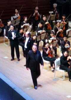 カヴァラドッシ代役のイヴァン・マグリは、チラシやプログラムの長髪と異なり、オールバックに眼鏡を掛けて登場し、唯一楽譜を見ての歌唱。大音量のオケの前でも歌声は聞こえ、トスカとの重唱も良い。アリア「妙なる調和」「星は光りぬ」の最高音も問題なく、歌唱後はオケが止まり、ブラボーの掛け声が掛かっていた。