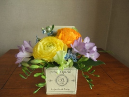 いつもお花のプレゼントをしてくださるTERUKOさんから頂いたお花を今日はブリキの器に入れてみました。黄色とオレンジのラナンキュラスに紫色のフリージアブルースターに黄緑色のスイートピー春のお花が勢ぞろいです。写真を撮っていたら我が家のきかんぼうぱんちょくん登場ではでは ぱんちょくんも記念撮影 いつもありがとうございます。ブログ村に参加しています。プチッとお願いします