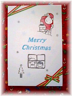 おりす。より Merry Christmas☆本日やっとポストインしてきたクリスマスカードです。ダラ癖のついたおりす。 一向にペースが上がらずあまりたくさん作ることができなかったので(って、はんこを2.3こぺたぺたした他は印刷じゃんっ★)ポストインと同時に ここでアップしちゃいました。お届けできなかった方、ごめんなさい(/(エ)\)近日中に届くはずの方、ご紹介とか不要ですので~(;^_^A サンタさんのはんこは 先日ちいこぶさんの葉書とコラボしたもの。このはんこを使いたいが為、窓の外を覗くこどもたちのはんこを彫り彫りしてみました。でもね~ 「サンタさん、子供たちがんがんに起きてますよ。プレゼント届けるのは寝てからじゃなくちゃ」と 我ながらつっこみたくなる構図になってしまいました・・・トホホ