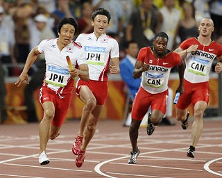 次に走る人の手に、下から添えて渡すことでバトンをつないで、次々と加速していました。