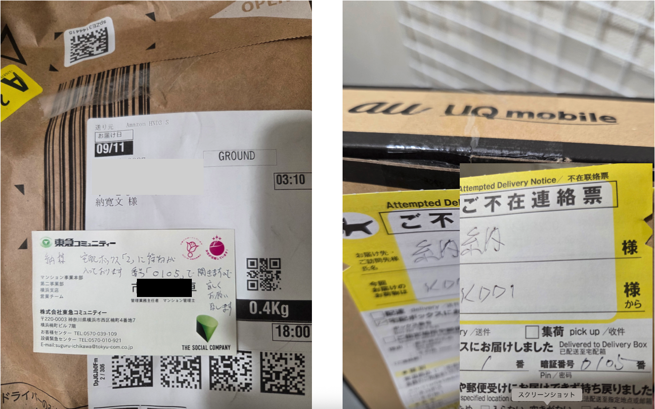 こちらは、約1ヶ月前に宅配ボックスに配達されたが暗証番号の記載がないため、開錠できず受け取れなかったもの。アマゾンより、宅配業者に連絡したが連絡が取れない?常識外の対応でした。配達した業者が暗証番号を忘れたんだったら、管理業者に連絡して開錠して貰えば良い。それをしないで放置されました。なので、商品を受け取れていないので解約して下さいと言われ、解約しました。私は、業者が管理会社に連絡して商品を引き取りにくると思っていましたが、その気配なく約1ヶ月が経過。そして、昨日、管理人から通知がありました。名刺にボックスの番号と暗証番号が記載されており商品を取り出して下さいと書かれてありました。管理人からすれば当たり前の対応かと思います。しかし、当たり前でないことも同時にありました。それは、右側の宅配が昨日、届きました。。SIMカードが届いたのです。その配達の不在カードにはボックス番号と暗証番号が記載されてありました。同じ暗証番号でした。KDDIからの荷物を配達してきた業者の暗証番号と管理人が書いた暗証番号が同じ。?普通は起こり得ないことです。さらに、筆跡が類似しています。また、書体、ぺんの細さも一致しています。ここれは、管理人の名刺に書かれていることから双方とも管理人が書いた確率が高いと思います。そうなると、KDDIからの配達は誰?となります。こんなところでも普通でな起こらないことが起きています。そもそも、アマゾンから配達されたものに対しての行いが異変すぎます。宅配ボックスに入れて暗証番号の記載がない。それを連絡し、業者から暗証番号の連絡をしてもらえるように通知したが、翌日になっても連絡が取れないと回答されました。自分ところで配達依頼をしている業者と連絡が取れないなんてあり得ることではありません。これは、胡散臭い匂いがします。目的は何かわかりませんが、この行動は何かの目的があるように思われます。そして、約1ヶ月経過してから、管理人からの通知です。ボックスに入っている荷物を出して下さいと書かれていますが、同時に他の配達の書体も暗証番号も同じさらに、胡散臭くなります。ここで考えられるのは、アマゾンからの荷物の処理についてです。この荷物を放置していた場合、それを逆手にとって泥棒扱いされる可能性を考えました。なので、昨夜、アマゾンに連絡をして、商品の引き取りに来てもらう連絡をしました。本来、キャンセルした商品であり、業者が引き取って帰るべきなのに私が引き取る形になることで、貶めようとしていることも考えられます。そうでなくても、全てが不自然なことが重なっています。汚職警官の定席嵌めること、貶めること、嘘をつくことなので、これらに少しでも理由づけされることがあったら、それをすぐに排除することが重要です。配達された商品が宅配ボックスに入れられ暗証番号の記載がないため実質、商品を受け取れない状況になり、配達した業者と連絡がつかないので解約して下さいと言われたので解約した商品です。ところが、配達先は私名義、宅配ボックスに入った状態で約1ヶ月放置それを管理人が暗証番号を再設定して私に受け取るように通知あり。ボックス内の商品の位置が90度変わっていたので管理人が確認に触ったと思われます。その商品は、実質私のものではないので、すぐに取りに来るようにアマゾンに連絡。その受付番号がこれ。本日の14時から16時の間に集配に来てもらえるように指定しました。こんなことをしなければならないのです。ほんまにようやるわ!完全に狂っているよ。商品を引き取りに来てくれました。25年10月4日16時30分ごろ。商品の受領書です引き取りに来た人が、商品を受け取った時に私に言ったのは、受領書 入りますか?えっ?一瞬疑いました。受領書は確かに受け取った証明書です。それを、入りますか?と言われました。信じられないことでした。私は、それがなかったら証明するものがないので入りますと回答し手渡してもらいました。この表現からも、推測は間違いではなかったように思いました。証拠をきっちり揃えておくことが重要です。それでも、でっちあげられることがあります。本当に狂った社会です