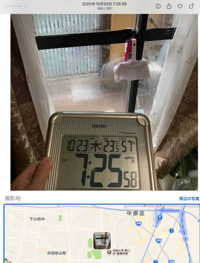 自宅で撮った写真の位置情報が正確に表示されたことがありません。外出先で行き先案内を使う時は、正確に表示されます。従って、位置情報がおかしくなっていないと判断できます。考えられるのは、パソコンや携帯電話に不正接続しているとそのパソコンの位置情報が表示されるため犯行がバレることから、それを阻止するために、位置情報をあちこちに変えているようです。これらの位置情報が異なるのは、不正接続しているパソコンの台数です。それぞれのパソコンで位置情報を変えているからです。この日に撮った写真の位置情報そして、本日も窓ガラスに大量の水滴を付着されていました。加害者は、これはあり得ると思い込んでいるというかあり得るという前提で会話を続けられると思い込んでいるようです。犯罪って、一度踏み込むとそれが当たり前だと思うようになりさらにエスカレートしていきます。これを重大な犯罪だと認識しなくなっていきます。つまり、精神が壊れていくのです。毎朝、起床し、洗顔している最中汚水を顔、口内に放り込むことに必死になっています。やっていることは陰湿で下品なことばかりです。最近は、小蝿などの小さな虫を目前に運んできます。加害者は、小蝿、蚊、蜘蛛などを飼育しているようです。汚いこと、下品なこと、嫌がらせなどが大好きな人たちであることがわかります。こんなことは、自分の人格であり、下品度が増すのは、人格を下げることです。それなのに、私に対しては、綺麗に使えとクレームを言ってきます。意味不明です。普通の会話が成り立ちません。これを読んでいる加害者さん病院に行って治療を受けなはれ!この日に撮った写真の位置情報この日に撮った写真の位置情報この日に撮った写真の位置情報パソコンで行き先案内を開始すると表示された現在地です。全く違う場所を表示しています。これも、パソコンに不正接続しているパソコンの現在地を知られないようにするための対策のようです。パソコンに標準装備されている天気アプリ使用は不可と表示されています。これは、現在地が表示されることで不正接続をしているパソコンの現在地がバレるので、使用できなくされています。こんなに明白な状況証拠が揃っていますが、それでも組織ぐるみで意味不明の説明で押し通してきます。写真が横向きになっています。これも嫌がらせの1つです。アップする前に写真を開いて、360度回転させてから保存をすれば、横向き妨害工作を防ぐことができます。それをしないでアップすると必ず横向きにされています。携帯電話でWi-Fiネットワークを使い、インターネットに接続している状態を確認するとインターネットには接続していないと表示されます。しかも、ルーターが3台も連なっています。つまり、これらは、不正接続に使われているルーターであり3箇所から接続できる状態になっているようです。