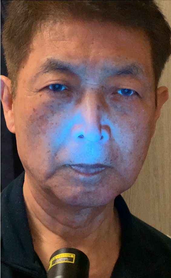 口と鼻の間、尾翼が赤く変色しています。この現象は、この部分に強い電波を照射されていることで起きます。このような場合鼻と口の間に異物を移動させ、次に鼻の中に移動させるときの電波強度の違いから起きています。また、眉毛の間、その上部のおでこの部分が白くてかっています。これは、透明色の塗料が付着しているときに見えます。こんな感じで、身体が赤く変色しているのは電磁波が身体に照射されていると判断できます。特に、身体全体がどす黒くなっている人、特に学生に多く見られます。日焼けのように見えますが、日焼けの色ではありません。また、日焼けだと数日で元の肌色に戻ります。それなのに、年がら年中、身体全体が日焼けしたように肌色が黒くなっている人物は集団ストーカー・テクノロジー犯罪の加害容疑者だと断定できます。このような色に変色しているのは、要注意人物とみなしています。