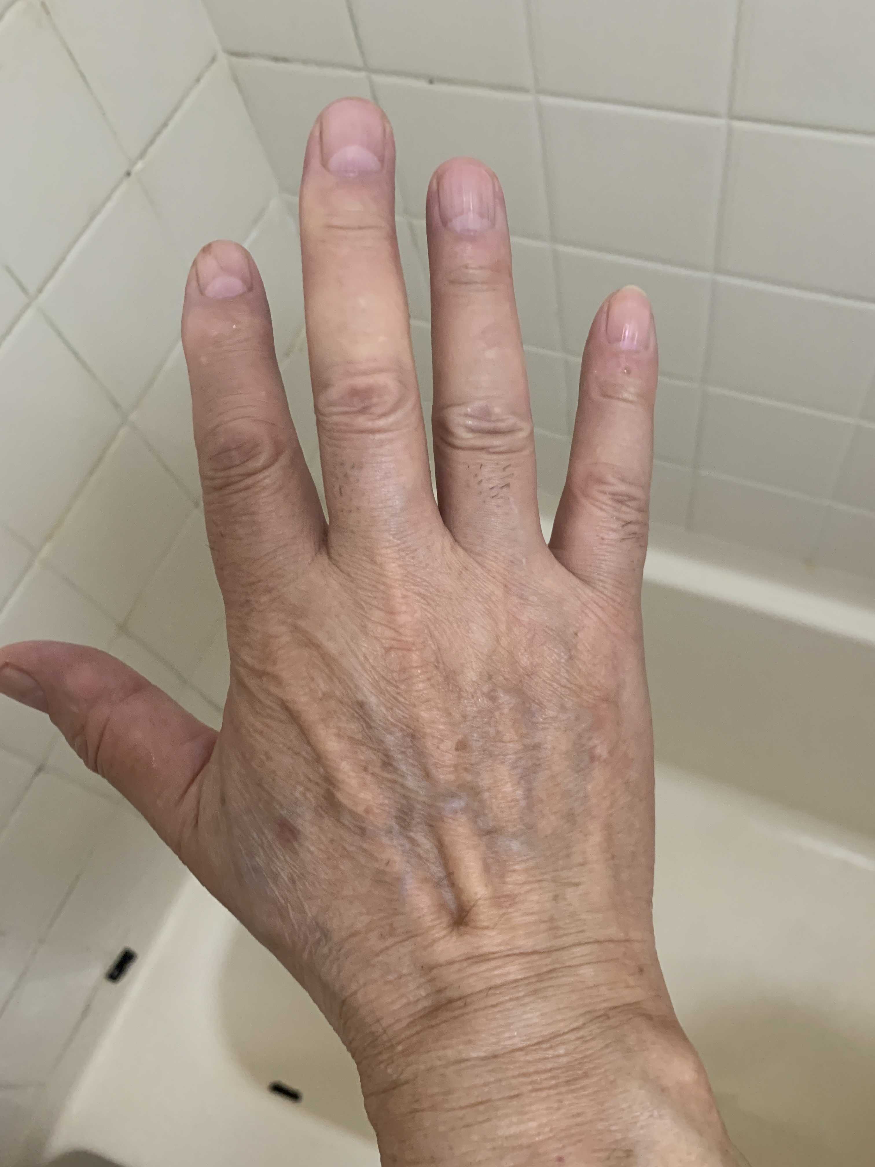 毎朝、洗顔時に起きること手の甲が赤く変色しています。指先は変色していません。でも、指の付け根から第一関節までが赤く変色しています。私がこの犯罪の被害を認識していないとき、これを見て不思議に思っていました。何故、手の甲が赤くなるんだろう?意味不明でした。。毎朝、洗顔時にこのような現象が起きていたらあなたは、テクノロジー犯罪の被害者です。左手の甲も赤く変色しています。こうなるのは、手を顔や口に持っていったとき手を経由して顔や目鼻口に汚水や汚物を移動させるためです。これは、洗顔時だけではありません。飲食時にも同じ現象が起こります。腕もこのようにどす黒く変色しています。これは日焼けによるものではありません。日焼けだと、1週間も経過すれば、元の色に戻って行きます。また、日焼けをするほど外出していないのに、黒く変色するのは電磁波による影響です。足や腕にこんな色に変色している人がいたらやばいです。加害者か被害者のどちらかです。