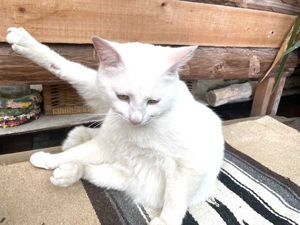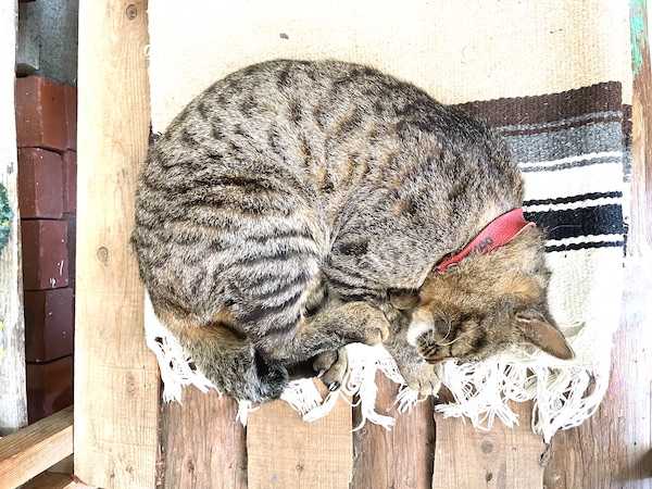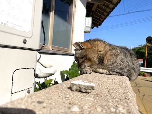 近くの壁の塀の上で人の気配に全く動じず休んでる猫。