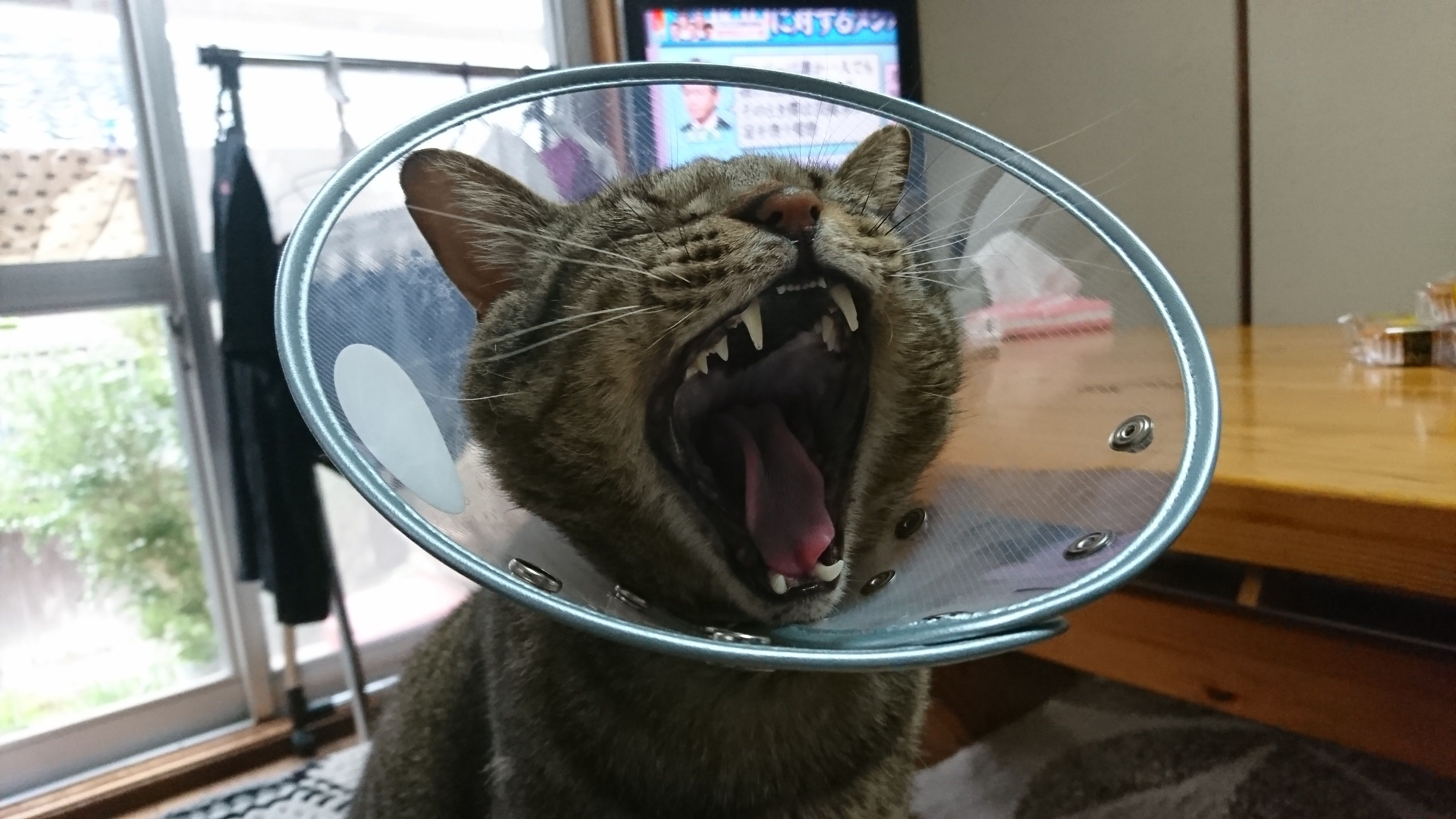 病院で二針縫ってエリザベスカラー付けました。