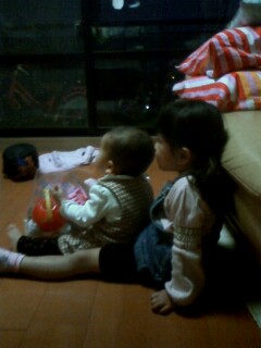 こんばんは。寒いし眠いしで布団に入ったのですが、結局寝れず携帯からブログアップしています。今日も本当に寒かったですね~っ。でも子供達は寒いのへっちゃらなのか、ベランダに出て遊んでました。写真は最近の2人です。帰って来てからテレビは見せていなかったのですが、30分だけ最近見せています。NHKですが。何故かさきはゆうきにひっつて見ていたので、思わず携帯で写真をとってしまいました。テレビだけでなく、ゆうきにまとわりつく次女さきなんです。滑り台をしていても、ゆうきがさきが滑って来るのを待っているんです。姉妹ってこんな感じなのでしょうか?かかは女兄弟いないのでわかりませんが。さて、ゆうきにちょっぴり変化が見られてきましたよ。スプーンやフォークの握り方を、全指握りから三指握りにかかが介入して変えました。そしたら、今日自宅でお絵描きするときに、自ら鉛筆握りをするから教えてと言ってきました。色ぬりも綺麗に塗れて本人は大満足でした。幼稚園での事も以前より更に話してくれるようにもなりました。ちょっとした変化だけど嬉しいです。きっと、こういった変化の積み重ねなのでしょうね。長い目で見守っていきたいと思います。さて、足も温まり眠くなってきました。そろそろ寝ます。おやすみなさい