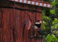ヤマガラは雌雄同色で一羽では区別がつきにくいけど、番なら大きいほうが雄。よく鳴く。放棄せずに巣作りを続けてくれて一安心。出掛けたり戻ったりしながら時々ふわふわした巣材を持ち帰る。5月4日昼11時半ごろ。不在の時に中を覗いたら卵が6つ。前回より一つ増えてる。夫が覗いた時は雌が卵を温めている最中で、見上げた上目遣いが可愛かったって。5月5日朝6時半。孵化してる!! 4羽?5羽? 開いた口は5mmないかな。卵がまだ一つもぐってるみたい。殻は片付けるんだね。孵化まで2週間ちょっとでしたね。親鳥はいつも緑色の虫をとってきて、近くの枝を飛び回って警戒しながら巣箱に入り、また飛び去る。台にのせたパンをよく食べてました。巣立つまで約18日、成功率は50%くらいなんですって。ヒナの声を聞いてヘビが登ってくるのを防ぐのにタバコの吸殻を根元にまいておくといいと地元で聞いたので次に来るまでとりあえず実行。