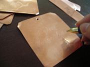 夫が 樹にネームタグをつけようというので、時間が経つと風合いがよくなる銅製のプレートにしようと思い、銅板を買ってきました。0.2mm厚の20×30cmで600~700円くらいですが、銅製の既製品のタグを買うよりも好きな大きさに作れるし安い。形を工夫しようとしたけど現状ではシンプルな方が合うので、そういうのはまたおいおいと。厚さが0.2、3mmくらいなら普通の工作用のはさみで切れます。穴あけはドリルです。先が太めのボールペンで、凹ますように文字や模様を書きました。いまはピカピカですが、だんだん黒ずんでくると思います。細い樹木やワイルドストロベリー用に作った小さなタグは、つけるととてもかわいいです。色が変化したらお知らせします。