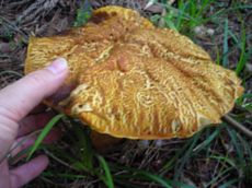 こんな感じであちこちに出ていたので、3本収穫しました。軸が太い。右は幼菌。成菌は傘がひび割れてきます。昨年秋の写真のように。マツ林に生えるらしいので、マツタケに似てるのかしら。マツタケ目アミタケ(イグチ)科の食用きのこですって。たしかに食べられそうな匂いがしますよ。夫が食べ方を調べて調理しました。傘の裏の黄色いスポンジ状の部分を落として、まずは軸から。バター焼きです。歯切れ、食感がいい。独特の香り。わりとおいしいです。何かと合わせた方が・・・ベーコンとかポテトとかチーズとかを引き立ててくれそう。こんがりバターに合ってます。使える。エリンギとは香りや食感が全然違います。どっちがいいか、となると好みかな。次は傘の部分です。湯がいて刺身だそうです。きのこの刺身か・・・。わさび醤油いきます。食感が・・・やわらかめの貝類。ホタテ! ホタテの刺身に近い感じ。いずれにせよ食べ応えがあります。ほんとに食べられるんだな。たくさん出てたんですよ。大きいから目立つ目立つ。手入れされた場所だと余計な存在感を放ってます。しかし結論。二人で食べるなら1本でいいや。