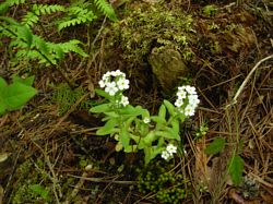 3年前に移植を試みたササユリです。そのときの日記に「採取した球根は翌年は開花するそうですが同じ場所だと病気になりやすく栽培するとなると難しいらしい」と書いてました。育生条件のストライクゾーンが狭く、移植を好まない弱い植物なのだそうです。種で増えるのですが、発芽しても初期育生が極めて遅く、10cm位になるのに5、6年かかるので雑草で覆われるとなかなか生き残れない。里山や森に人の手が入らなくなるとそういう状況になるってことですね。近年ササユリはだいぶ減ってしまって採取は慎みましょうということになっています。花が咲くまでに7、8年。なんですが、隣地の斜面にけっこう咲いてるので地主さんに話して1球掘らせてもらい、直線距離にして70mくらい移動させてみたわけです。2007年、花が終わった8月でした。今年も大丈夫でしたね。3度目の蕾がつきました。同じ環境ですからね。あとは何年咲くか。増えるのか。地表を苔で覆っているので雑草負けのない環境です。1番目の種が2年前なのでまだまだ、先の長い話です。